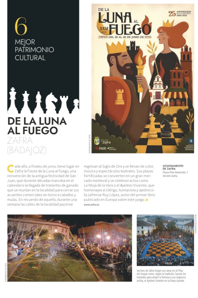 La revista Historia National Geographic ha otorgado a la localidad extremeña de Zafra, el premio en la categoría ‘Mejor Patrimonio Cultural’, por el festival ‘De la Luna al Fuego’ donde, entre otros elementos, el ajedrez juega un papel determinante.