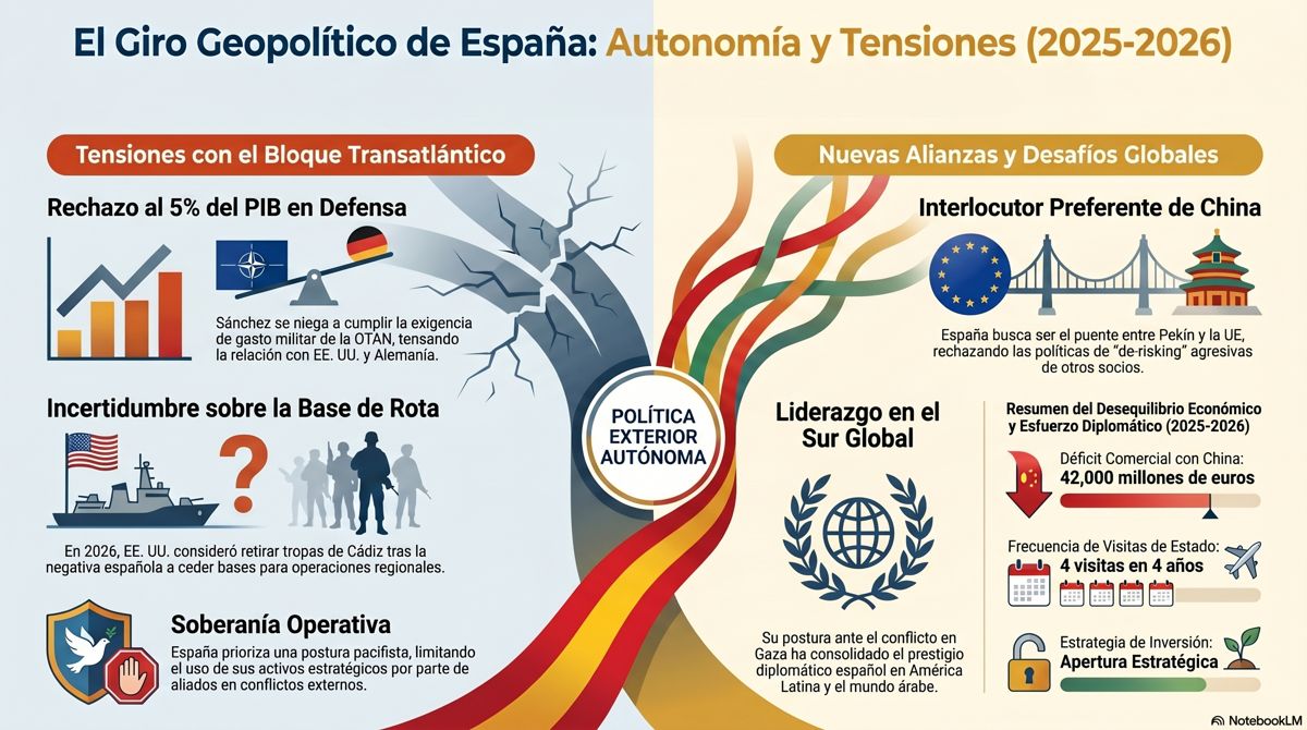 El perfil de «estrella internacional» de Sánchez ha chocado frontalmente con las prioridades de seguridad de aliados tradicionales, especialmente Estados Unidos. El FAZ y otras fuentes internacionales han documentado un deterioro significativo de las relaciones entre Madrid y Washington, exacerbado por las divergencias en política de defensa y la postura española ante conflictos regionales.