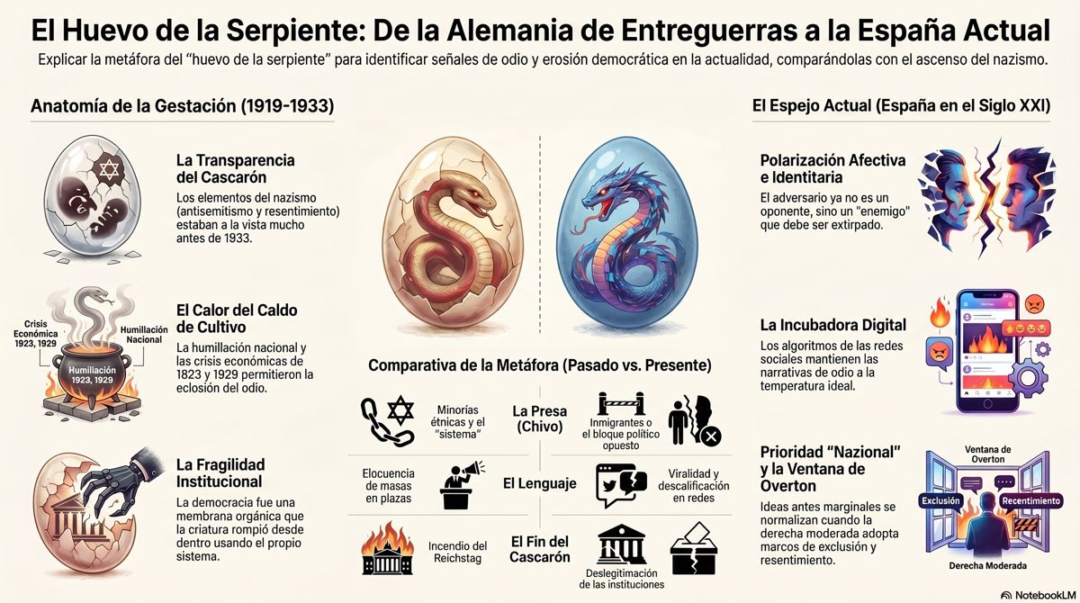 - La incubadora digital: A diferencia de los años treinta, hoy existen «incubadoras digitales» de alta precisión. Los algoritmos de odio en las plataformas digitales mantienen el huevo a la temperatura ideal las veinticuatro horas del día, creando cámaras de eco donde solo se escucha el siseo de la propia «serpiente».