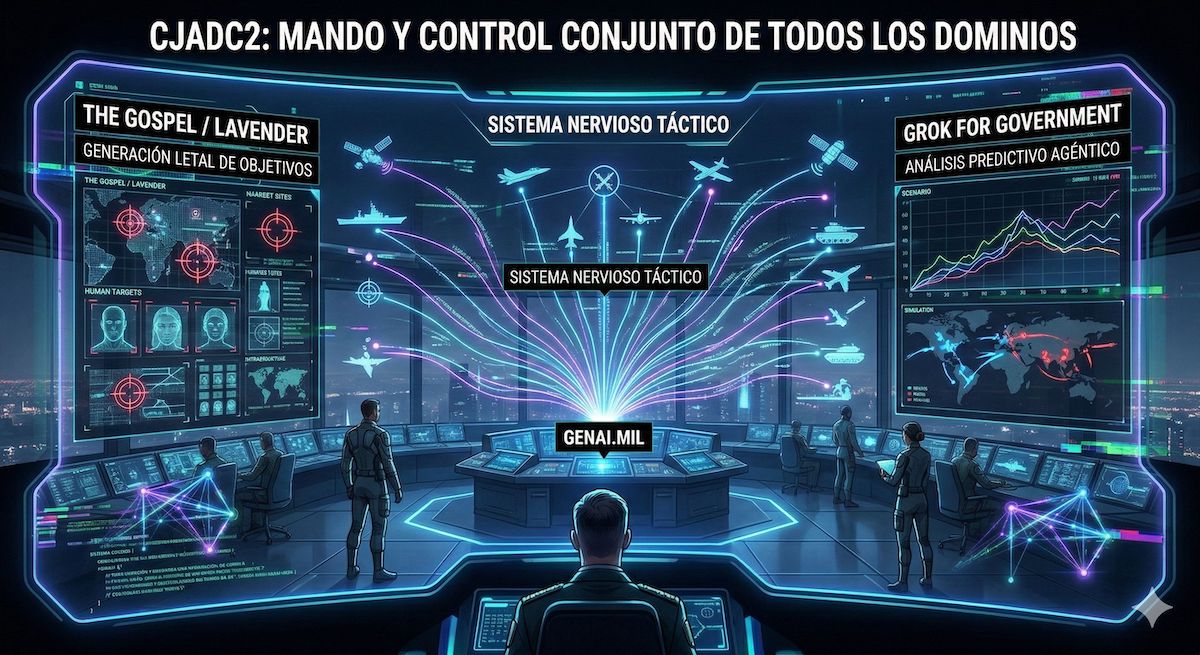A través del análisis de la integración de plataformas como GenAI.mil en el Pentágono, el uso de sistemas de selección de objetivos como «The Gospel» y «Lavender» en Israel, y el cambio doctrinal hacia el Mando y Control Conjunto de Todos los Dominios (CJADC2), este documento demuestra que, si bien la IA no posee autoridad de mando, se ha convertido en el sistema nervioso central insustituible de la guerra moderna.