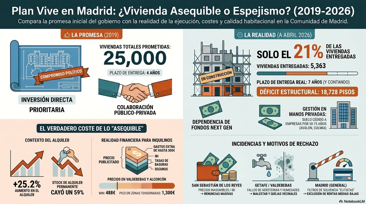 Aunque el ejecutivo regional ha ajustado su discurso para prometer 14.000 viviendas al cierre de la presente legislatura, la investigación de medios como El Plural destaca que la realidad presupuestaria y de ejecución arroja un déficit de 18.728 pisos respecto a lo anunciado en 2019.
