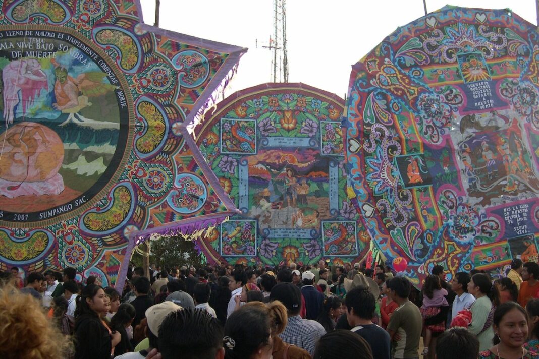 En los municipios de Sumpango y Santiago Sacatepéquez, miles de personas se reúnen en los cementerios para elevar enormes barriletes, cometas gigantes de hasta veinte metros de diámetro hechos con papel de seda, caña y colores vivos.