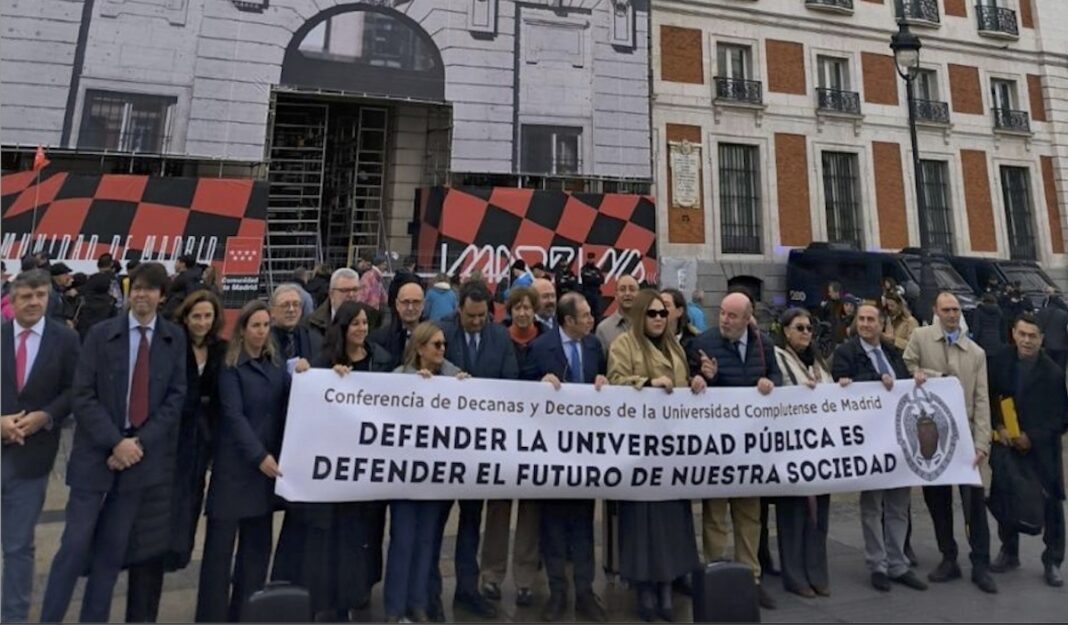La movilización, inicialmente impulsada por sindicatos y plataformas, adquirió una dimensión institucional decisiva cuando los veintiséis decanos y decanas de todas las facultades de la Universidad Complutense de Madrid se concentraron el 14 de noviembre 2025 frente a la sede del Gobierno regional, en la Puerta del Sol. Su presencia, registrada en la fotografía que acompaña esta información, reforzó la dimensión simbólica del conflicto.