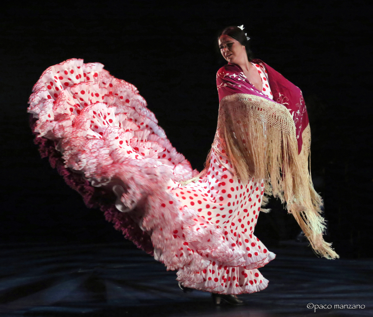 Desde ahí, todo fue un deslizarse por un espacio de arte, bordando palos que ella fue vistiendo en armonía con su solemnidad o su fiesta, se ve que conoce perfectamente la importancia del vestuario; insufló vida propia a una bata de cola llena de lunares por alegrías, sabiendo estar en cada momento, bien dejándose llevar por sus cantaores, Antonio Campos y Juan Ángel Tirado y por su guitarrista, José Fermín Fernández, un virtuoso; o creando con el silencio como fondo la mejor percusión del mundo con su punta y tacón. Estuvo divina.