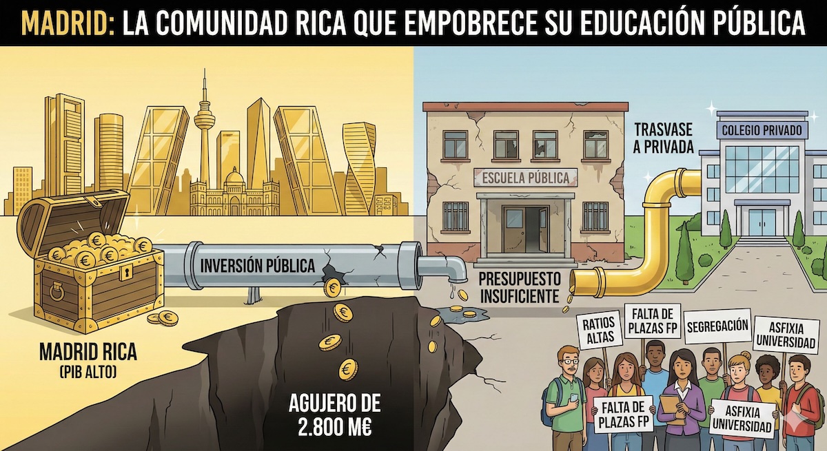 El sistema educativo madrileño no sufre una crisis puntual, sino una crisis de modelo. La combinación de infrafinanciación pública, expansión privada y falta de control sobre la segregación ha generado un escenario de desigualdad estructural.