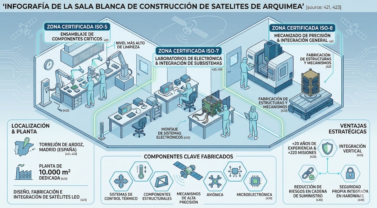 Arquimea fabrica e integra sus satélites y componentes espaciales principalmente en sus instalaciones de Torrejón de Ardoz, en Madrid.