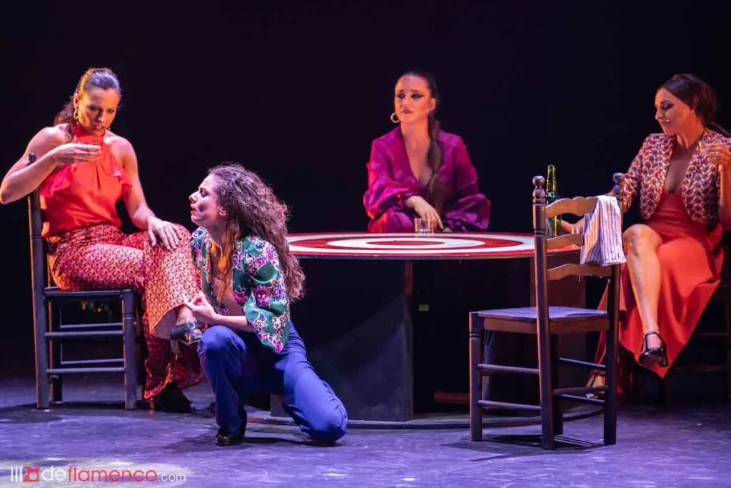 Cuatro chicas, una mesa – diana con inverosímil capacidad de transformación, y mil botellas por el suelo comparten protagonismo en esta taberna donde no solo cuatro mujeres, todas las mujeres vienen a soltarse la melena, a ser totalmente libres.