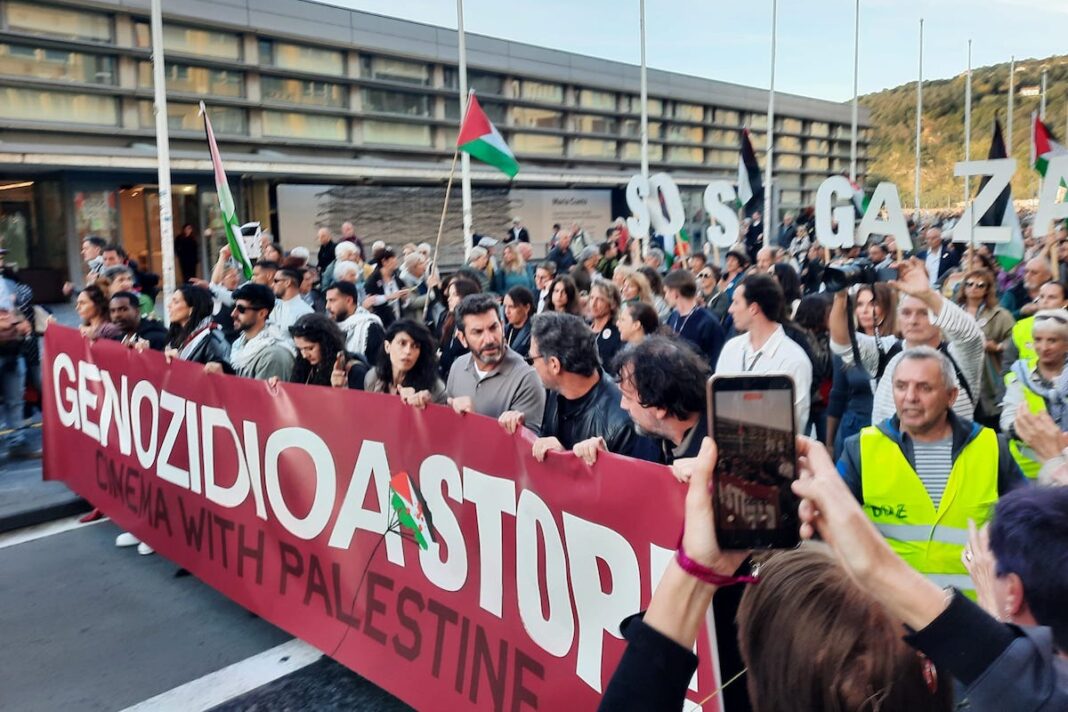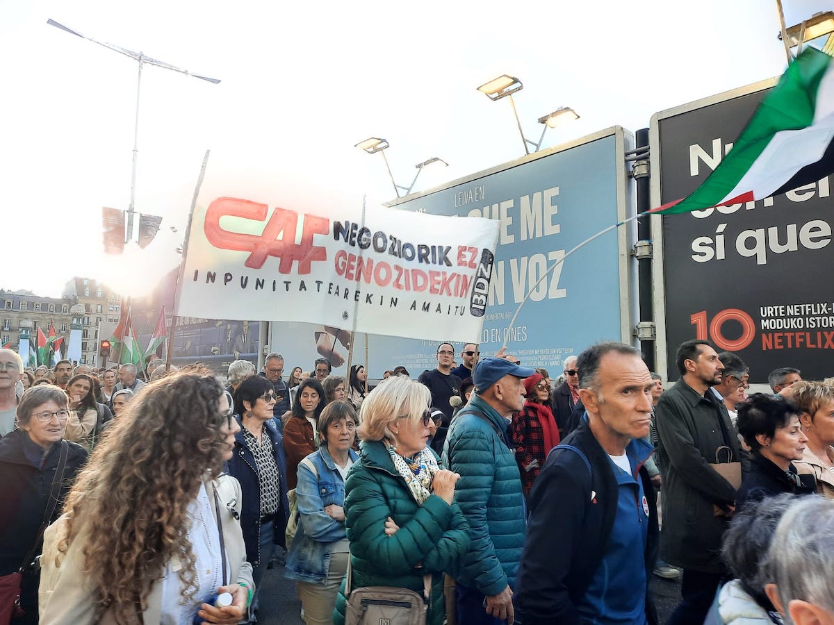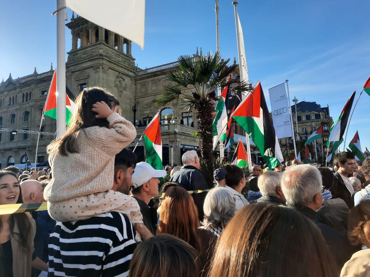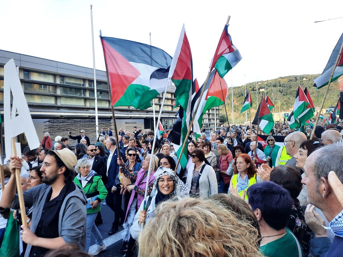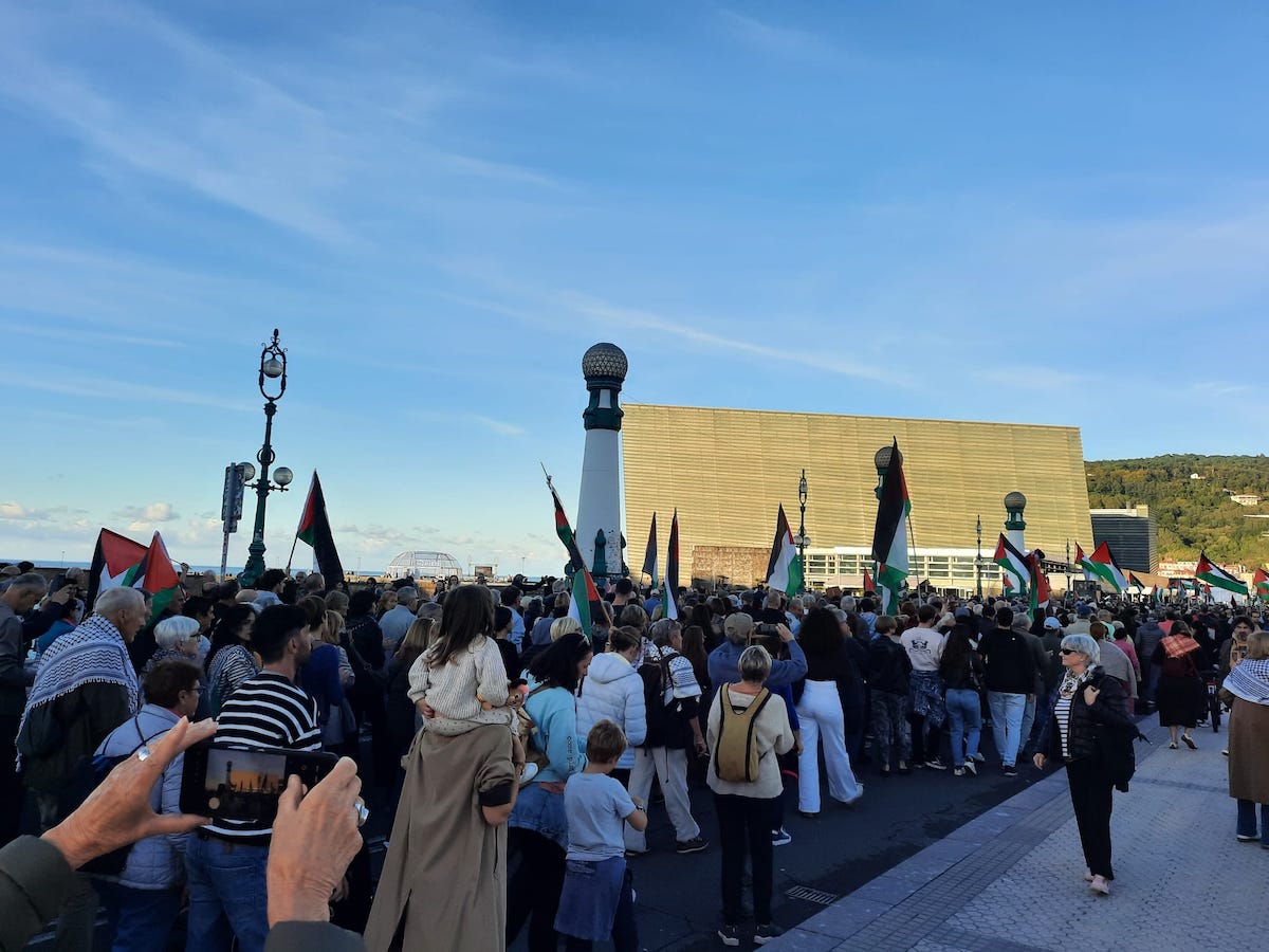 Tras la proyección en el teatro Victoria Eugenia de la película «The voice of Find Rajab» de la directora tunecina Khaouter Ben Hacia (ganadora del León de plata en el reciente festival de Venecia) una masiva manifestación ciudadana recorrió las calles de San Sebastián. Un grito unánime lanzado por miles de manifestantes en medio de una marea de banderas palestinas: «Palestina askatu» (Palestina libre), «No es una guerra, es un genocidio», que culminó con un acto homenaje al martirizado pueblo palestino.